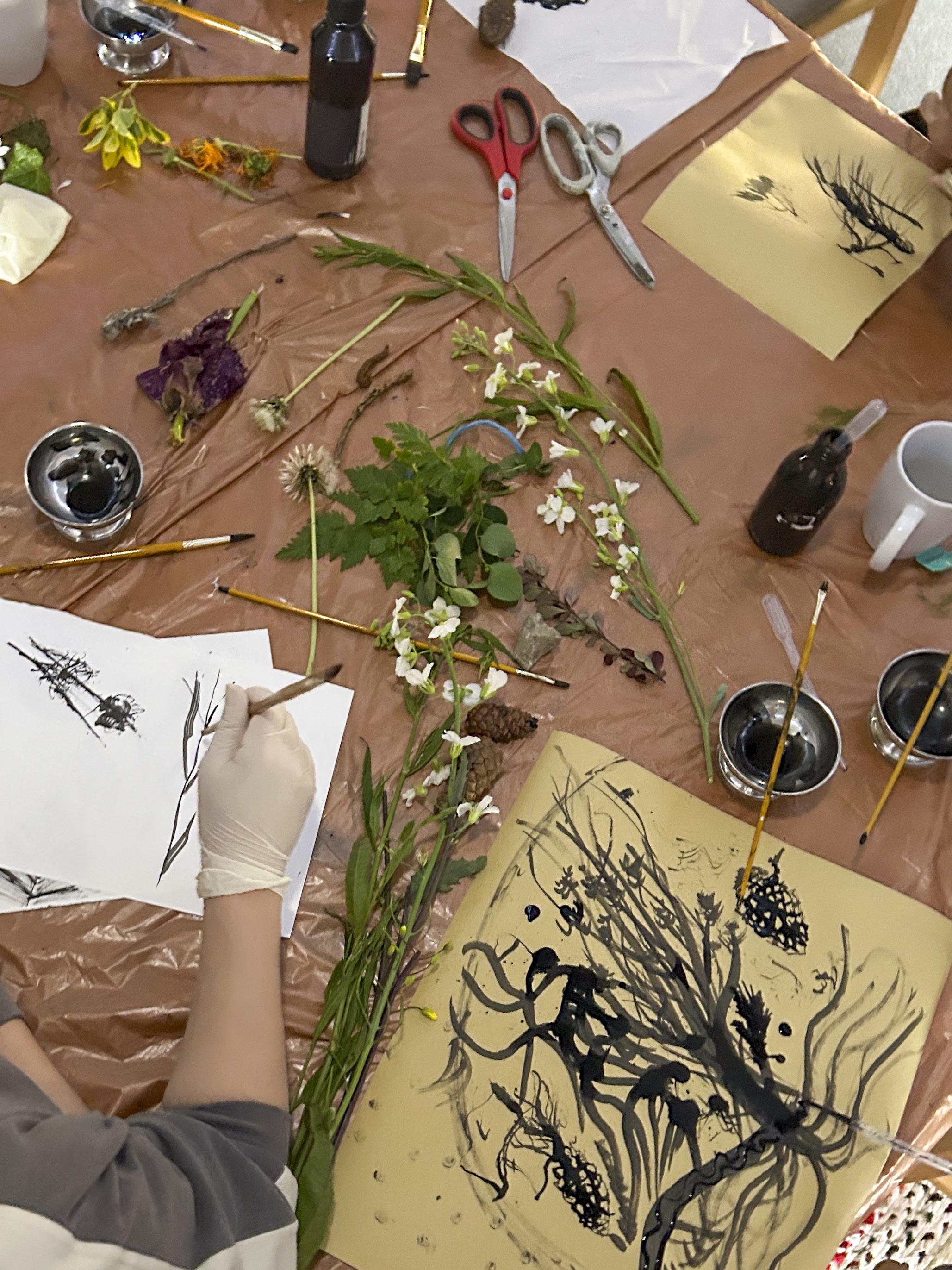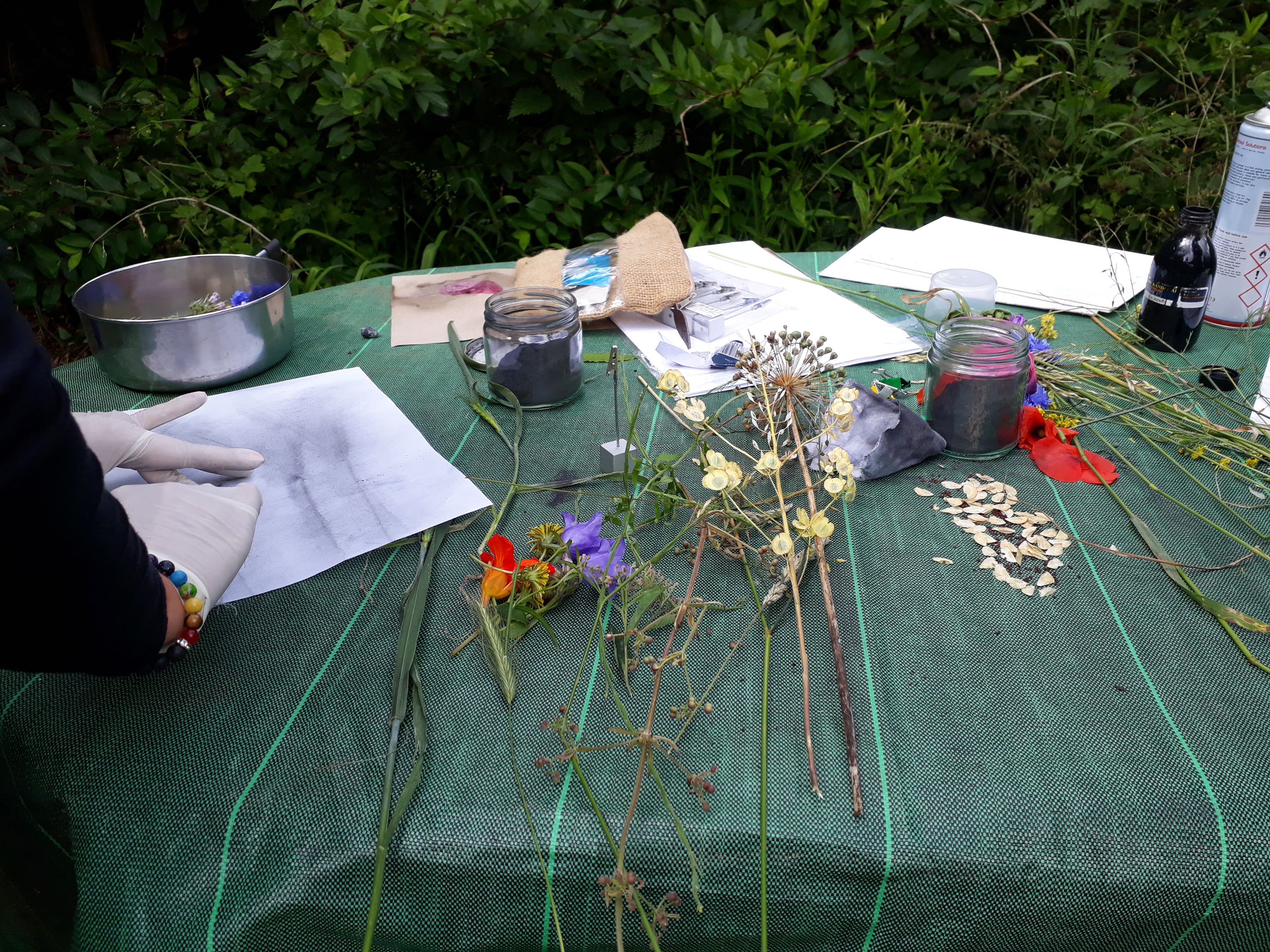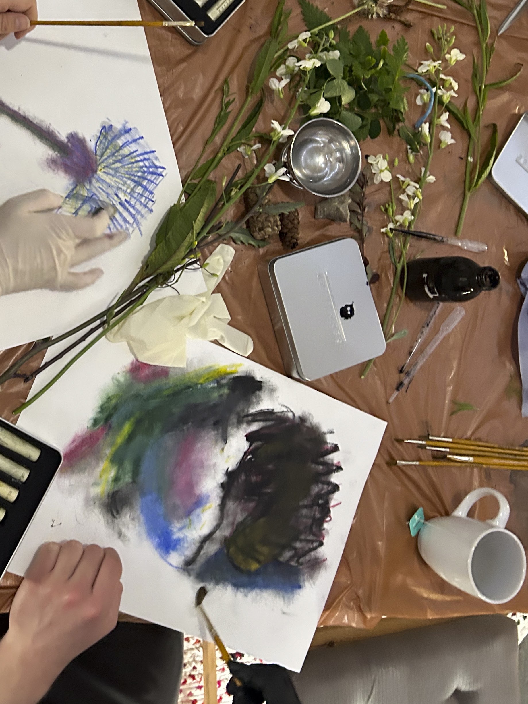 Graphite powder drawings and natural inks with participants at the C2C Allotment, Northampton