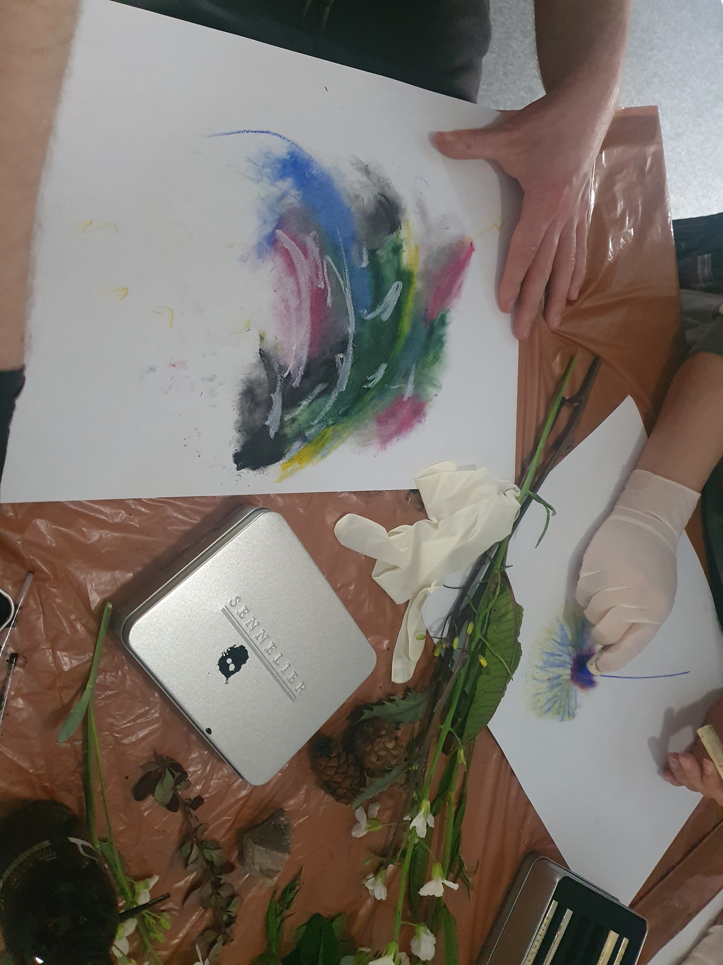 Ink and oil stick mark making with participants at Sol Haven, Northampton