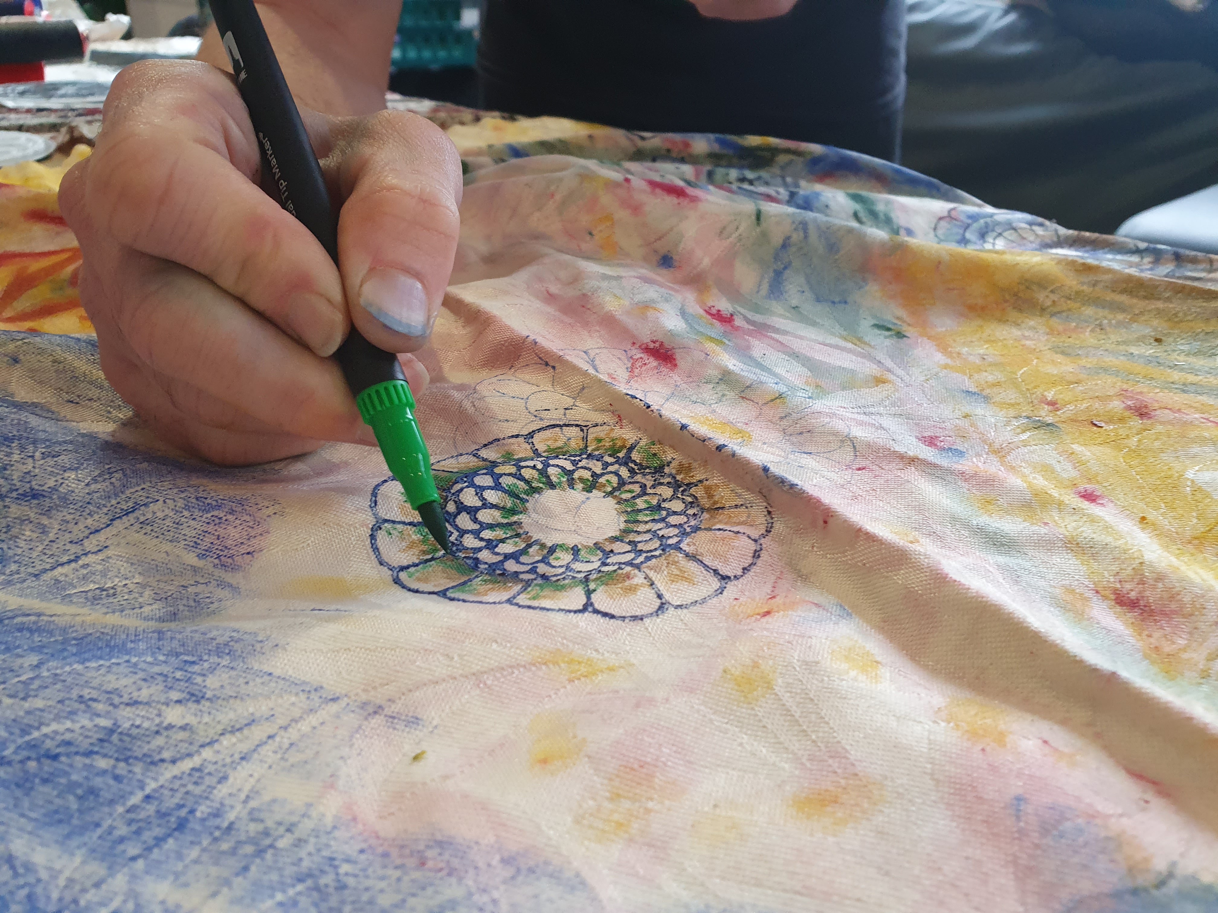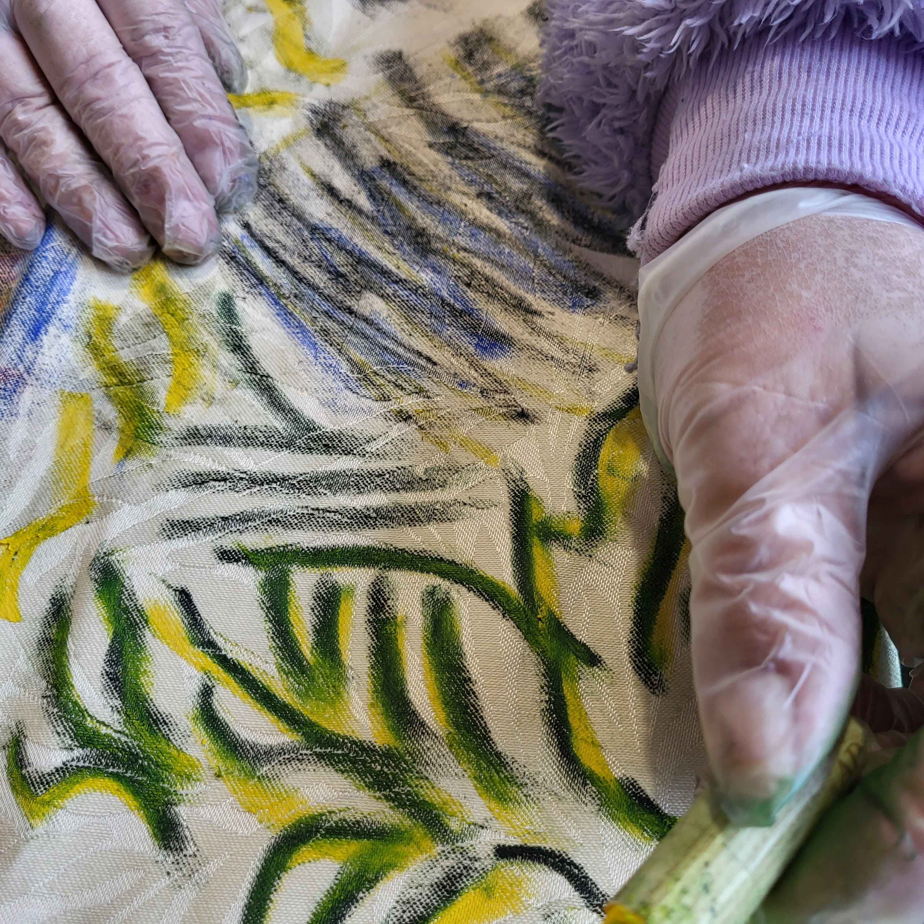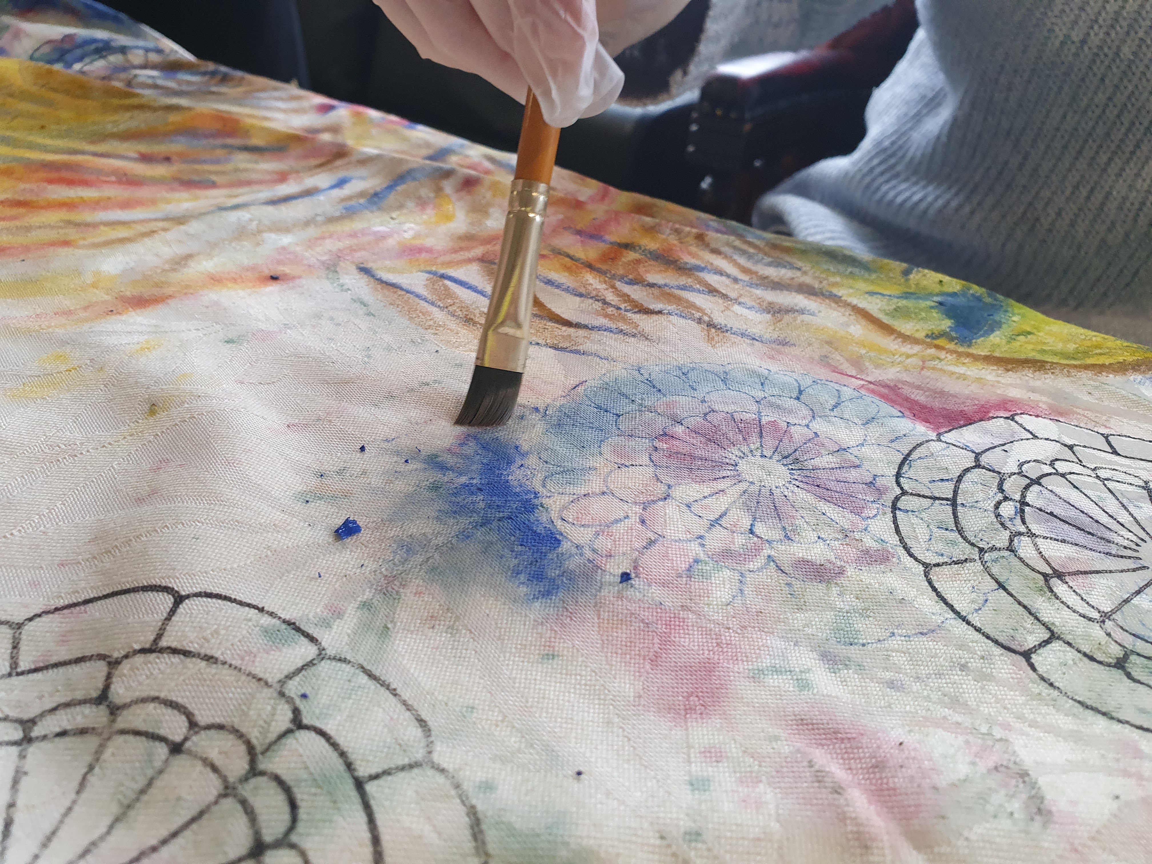 Oil painting and printmaking on curtains with participants at The Hope Centre, Northampton