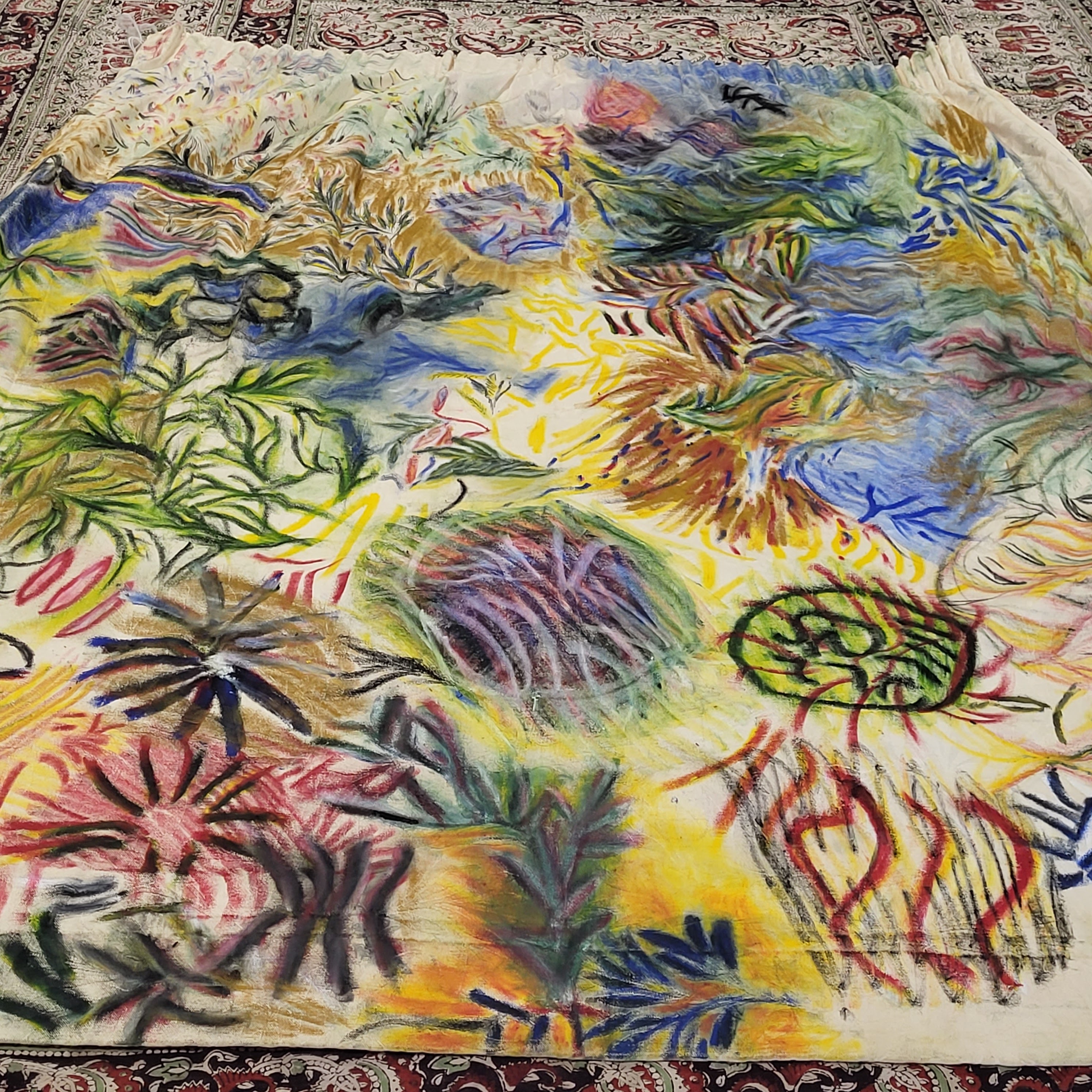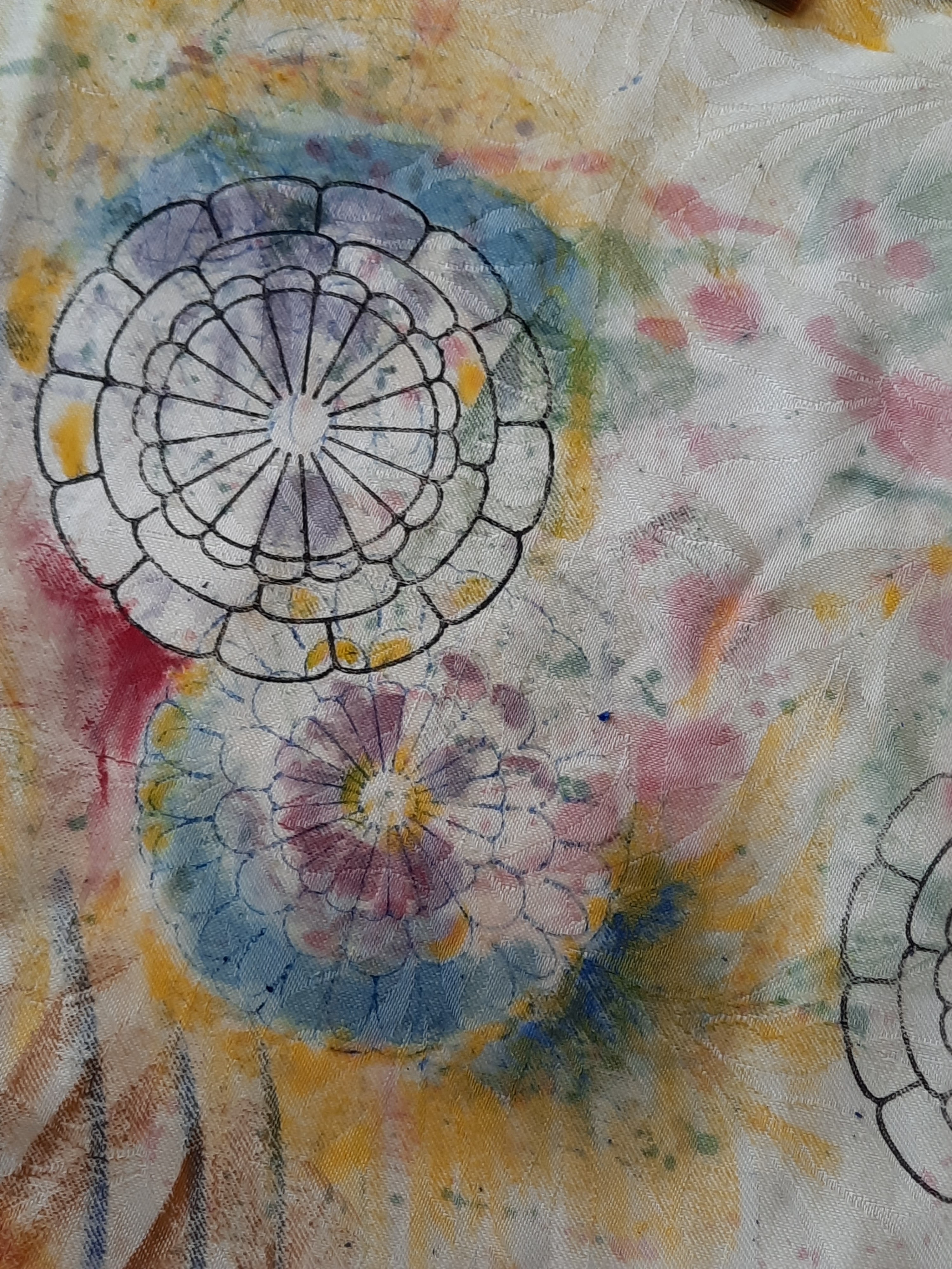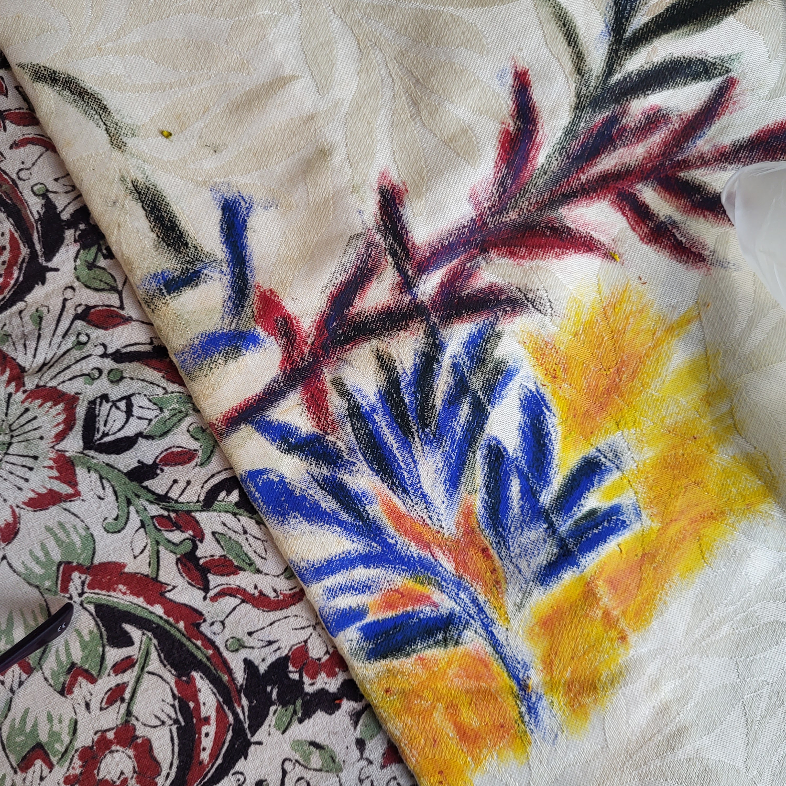 Oil painting and printmaking on curtains with participants at The Hope Centre, Northampton