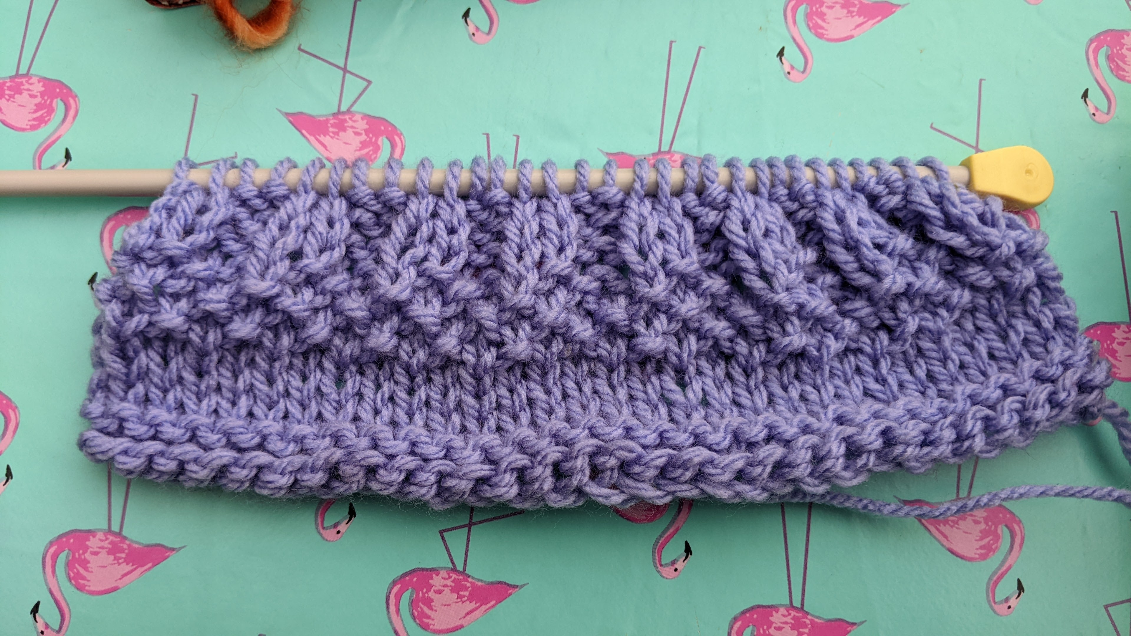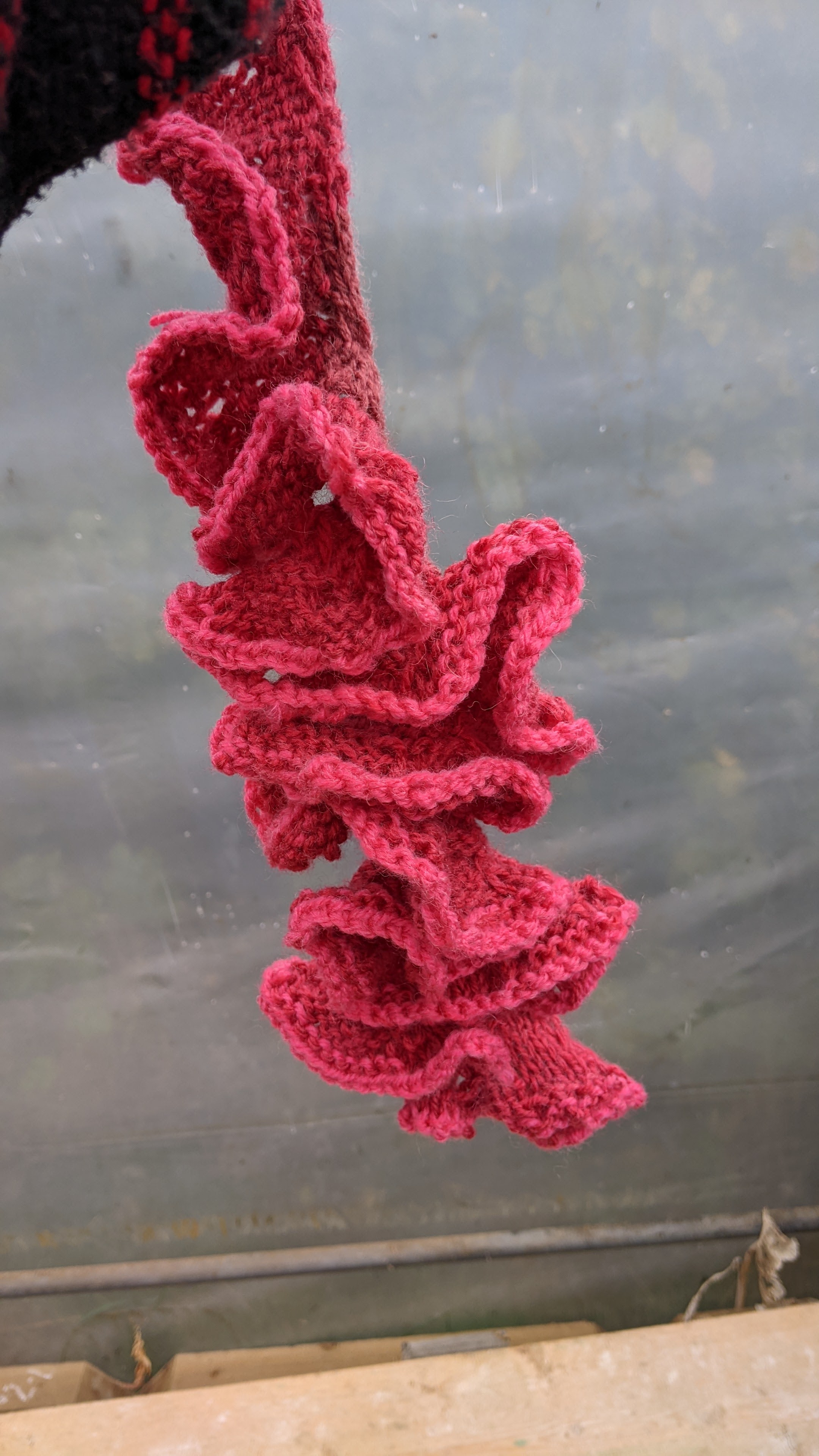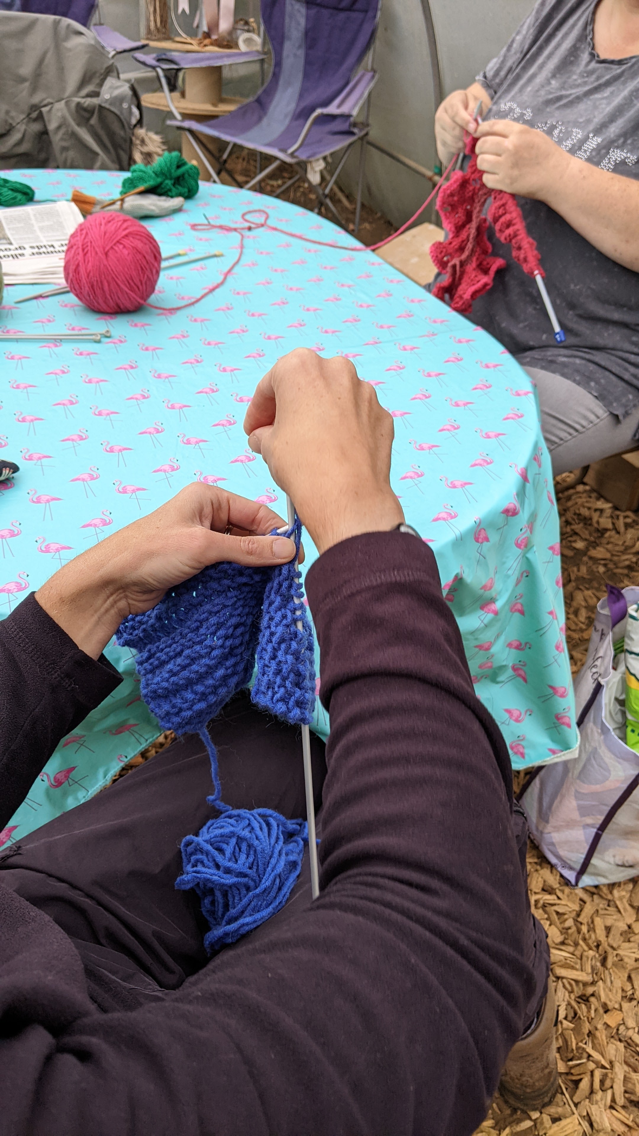 Knitting circle (pond algae, left handed, haven’t in years and pro) with participants at the C2C Allotment, Northampton